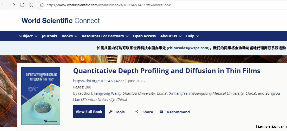 近日,生物医学工程学院(未来技术学院)颜心良博士与汕头大学王江涌教授和连松友博士合著的英文学术专著《Quantitative Depth Profiling and Diffusion in Thin Films》已由国际知名出版社World Scientific正式出版发行。
