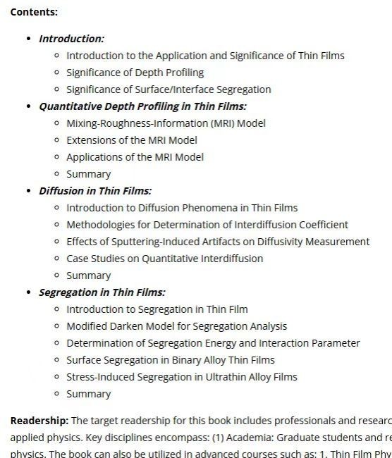 南非自由州大学H.C. Swart高级教授给予专著高度评价。他在序言中写到,“本书深入探讨了薄膜材料中运用的定量深度剖析精确分析处理技术,这是一个在广泛行业中越来越重要的技术。作者同时揭示了薄膜中的扩散和偏析等复杂现象,这些现象对电子、能源和航空航天等领域材料创新的持续发展至关重要。这项工作的独特之处在于作者既描述了深度剖析的理论基础又结合深度剖析的实际应用进行诠释,详细探讨了二次离子质谱(SIMS)和俄歇电子能谱(AES)等技术,以及深度剖析的MRI模型。本书不仅在学术背景下考察了这些方法,还强调了它们在精确材料表征至关重要的行业中的实际应用。除了技术重点外,本书还强调了理解薄膜中的扩散过程和偏析行为的重要性,这些现象直接影响薄膜的性能和可靠性,使其对于优化现实应用中的材料性能至关重要。”