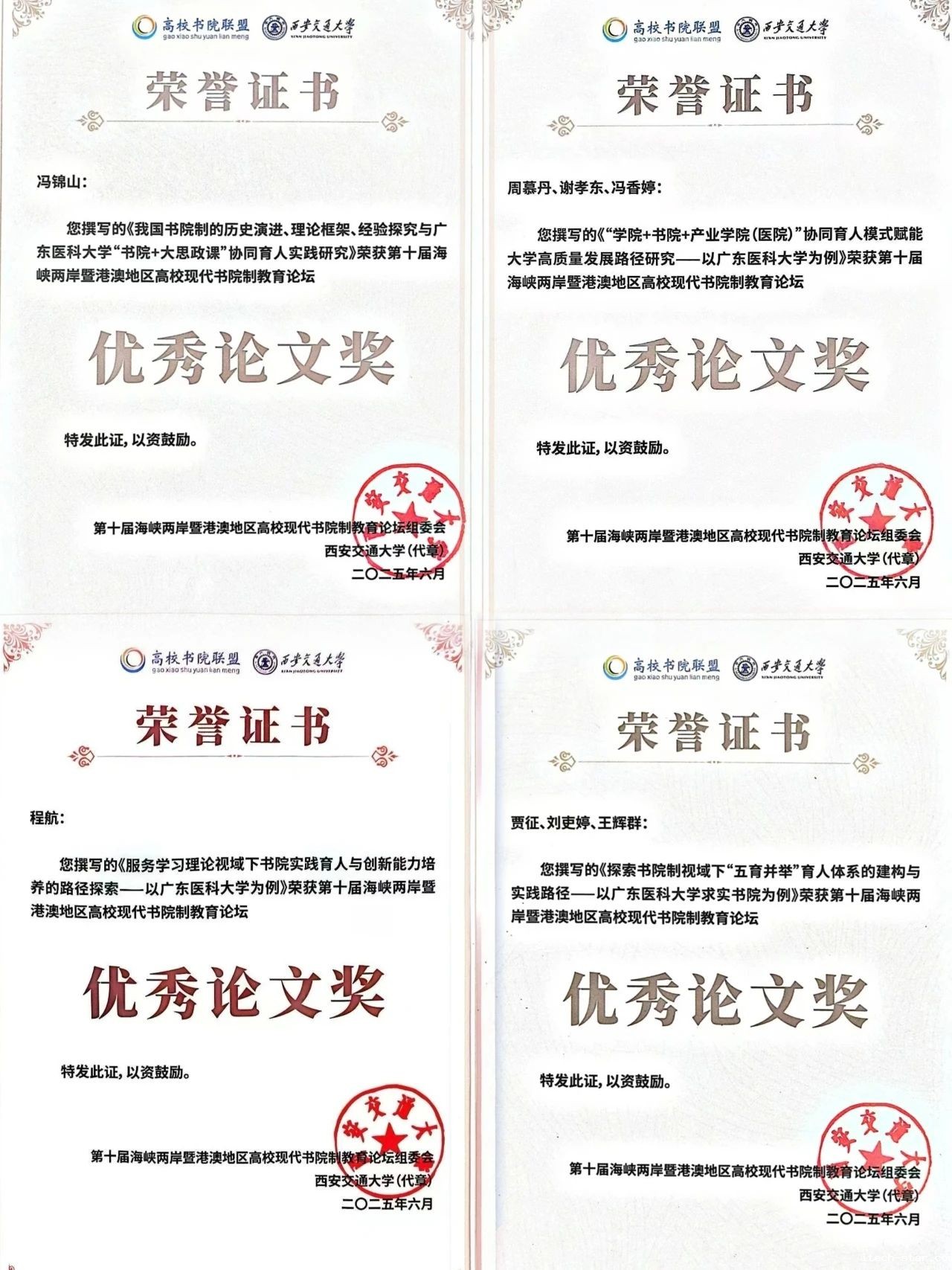 优秀论文分别为周慕丹、谢孝东、冯香婷《“学院+书院+产业学院(医院)”协同育人模式赋能大学高质量发展路径研究--以betway首页为例》;冯锦山《我国书院制的历史演进、理论框架、经验探究与betway首页“书院+大思政课”协同育人实践研究》;贾征、刘吏婷、王辉群《探索书院制视域下“五育并举”育人体系的建构与实践路径——以betway首页求实书院为例》;程航《服务学习理论视域下书院实践育人与创新能力培养的路径探索——以betway首页为例》。