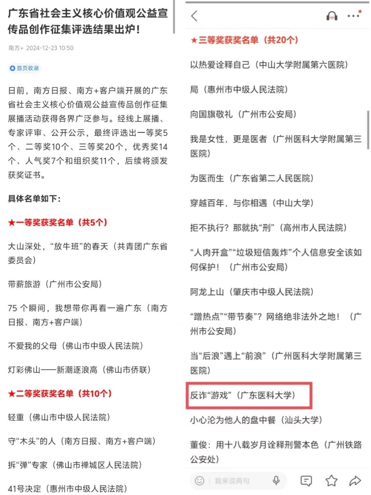 为深入贯彻落实习近平总书记关于社会主义核心价值观建设的重要论述精神,由省委宣传部指导,南方日报、南方+开展的广东省社会主义核心价值观公益宣传品创作征集展播活动于近日满落下帷幕。经线上展播、专家评审、公开公示,最终评选出一等奖5个、二等奖10个、三等奖20个,优秀奖14个、人气奖7个等。其中,由我校周圆、徐畅老师指导,罗淳康、邓芷莹、吴文莉、刘望龙、黄禹诚、符川川、金士博、陈子欣同学组成的参赛团队的作品《反诈“游戏”》荣获三等奖。